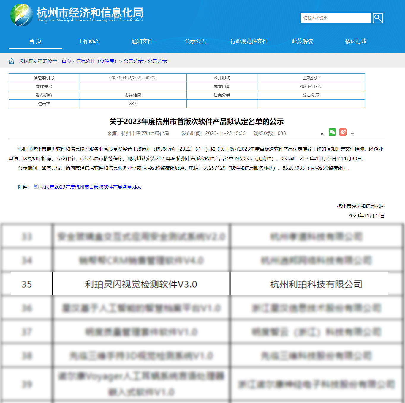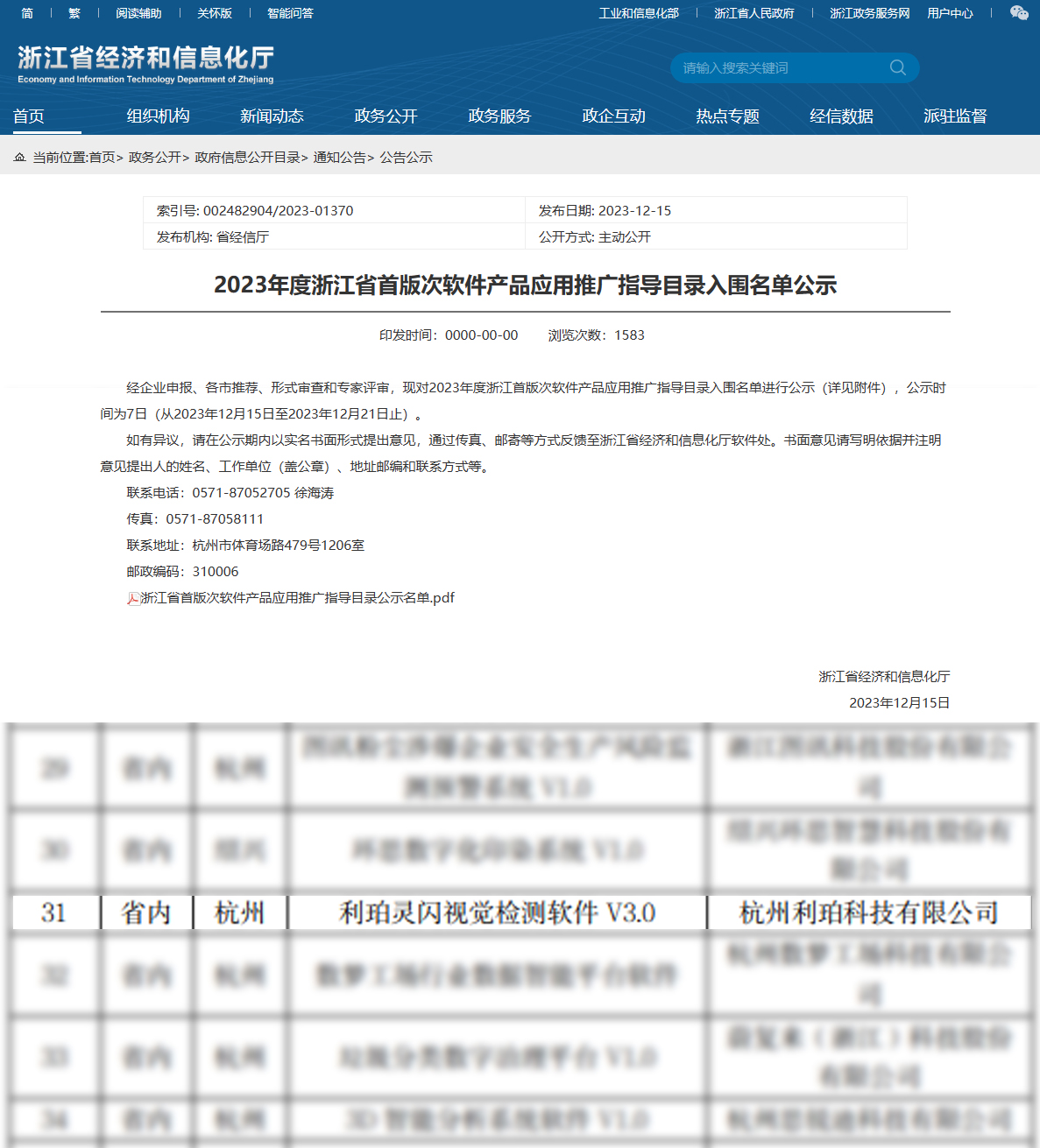 12月22日,经企业申报、各市推荐、形式审查和专家评审,乐竞官网-乐竞(中国)一站式体育服务官方网站“利珀灵闪视觉检测软件V3.0”成功入选2023年度浙江省和杭州市首版次软件产品认定名单。此次入选,标志着利珀在软件领域的再一次突破,技术优势以及研发成果获得了省、市级专家的高度认可。
