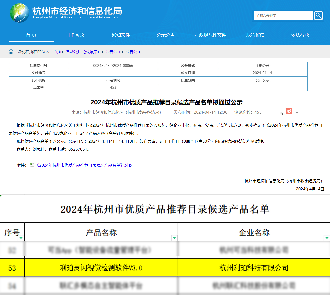 近日,杭州市经济和信息化局公布了《2024年杭州市优质产品推荐目录候选产品名单》,利珀科技自主研发的“利珀灵闪视觉检测软件V3.0”成功入选该目录名单。