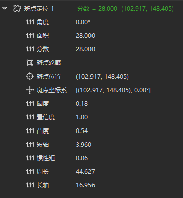 在提取到斑点后,灵闪会输出斑点的相关算法结果来作为相关检测的依据,例如把面积的大小作为缺陷判断标准的依据,通过斑点位置进行缺陷区域的切割等,具体算法结果如图6所示。